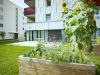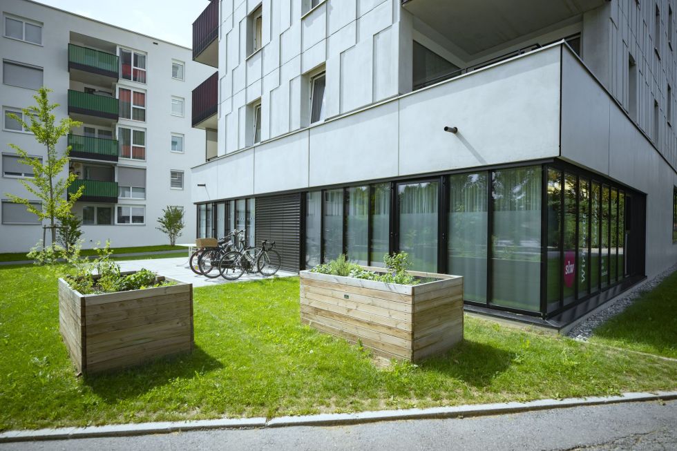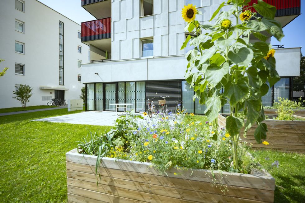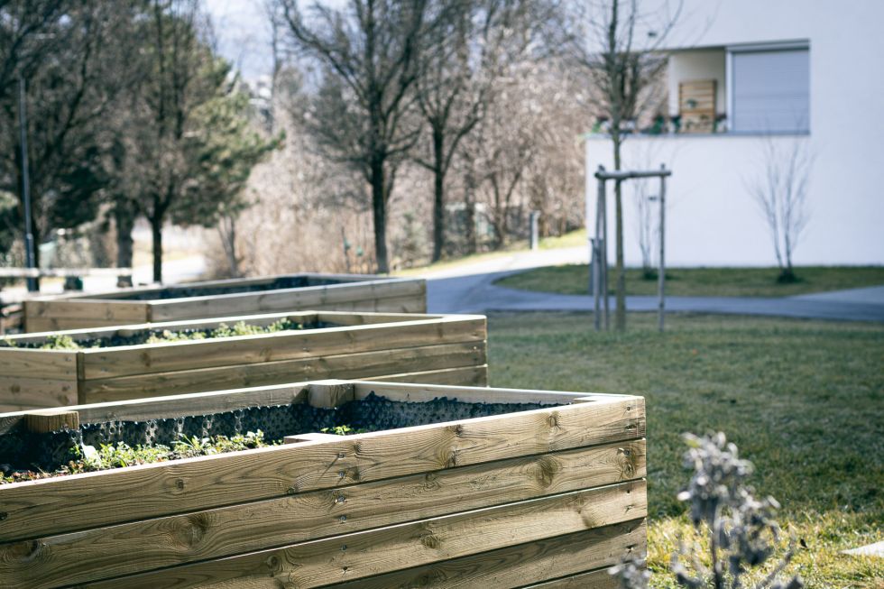 In unserer Tagesstruktur gibt es eine großzügige Terrasse. In Hochbeeten können wir unser eigenes Gemüse und Kräuter setzen.